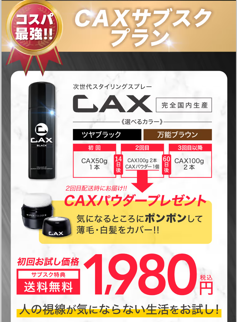 周りの視線が気になって購入しました。今までは帽子を被って隠していましたがCAXを使い始めてからは帽子が不要に。外出先や電車の中でも人の目が気にならなくなりました。